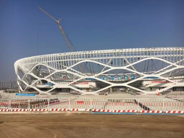 棗莊體育館是鋼結構所承接的又一大型體育場館,其屋蓋采用的大跨度索膜結構體系,該索膜體系是目前國內施工難度最大的體育場館索膜結構體系。跨度260*240米,采用是馬鞍形上下雙層環索斜拉交叉索體,索體總重量約1600噸,單索張拉力達300噸。